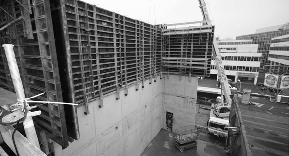 Op grote hoogte in het werk gestorte wanden vereisen ervaring en kennis bij het bouw.