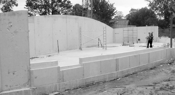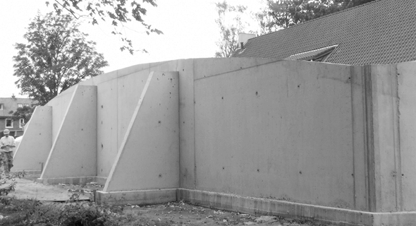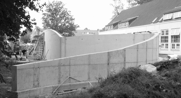 Realisatie van een futuristisch bouwproject waarbij de betonstructuur van de lokalen aan 1 buitenzijde wordt overdekt en afgevuld met een grondwal die men laat begroeien.